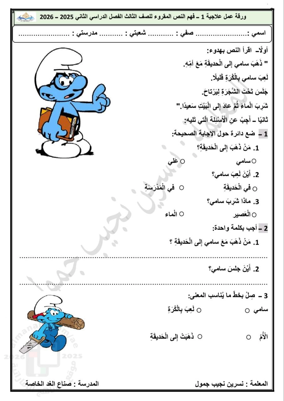 معلومات الملف: ورقة عمل علاجية (١) لفهم النص المقروء – تلخيص · تُعد هذه الورقة نشاطًا علاجيًّا لطلاب الصف الثالث الابتدائي، الفصل الدراسي الثاني (2025–2026)، لتنمية مهارة فهم النص المقروء. · تشتمل الورقة على نص قصير يدور حول طفل يدعى سامي، ذهب مع أمه إلى الحديقة، حيث لعب بالكرة قليلًا، ثم جلس تحت الشجرة ليرتاح، وشرب الماء قبل العودة إلى البيت سعيدًا. | ||