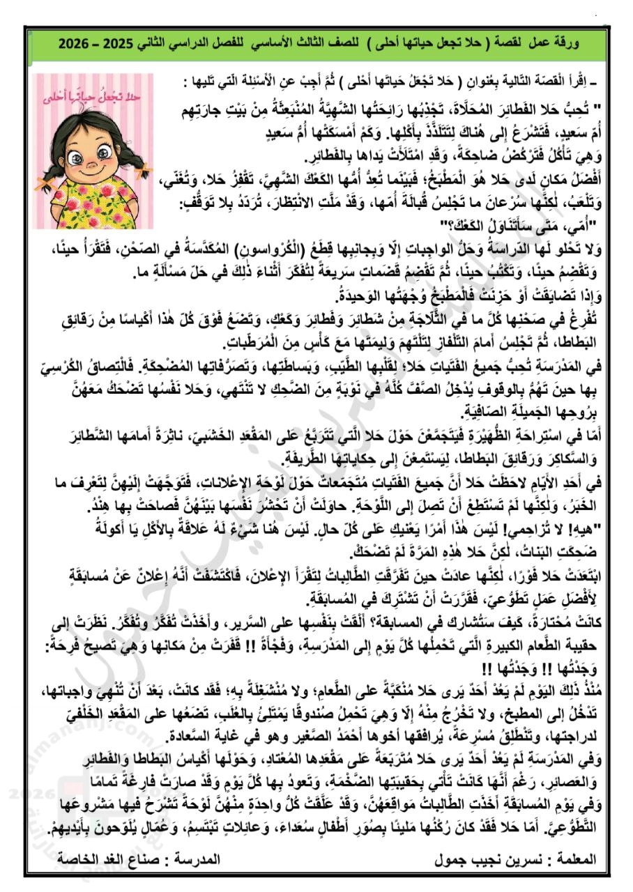 | ورقة عمل قصة حلا تجعل حياتها أحلى - إعداد: نسرين نجيب جمول | ||