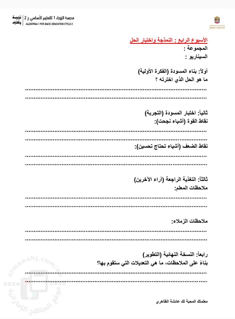 | ورقة عمل النمذجة واختبار الحل (الأسبوع الرابع) من التعلم القائم على المشاريع - إعداد: عائشة الظاهري | ||