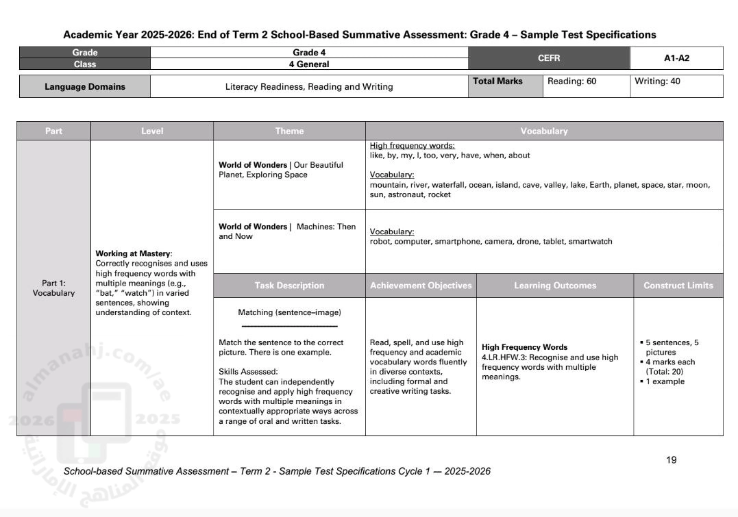 معلومات الملف: مواصفات الاختبار النهائي للفصل الثاني ( الهيكل الوزاري ) المسار العام Sample test specificatons School - based summative assessment End of term 2 Academic year 2025 - 2026 | ||