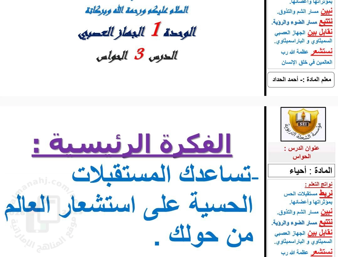 | شرح الدرس الثالث الحواس من الوحدة الأولى الجهاز العصبي - إعداد: أحمد الحداد | ||