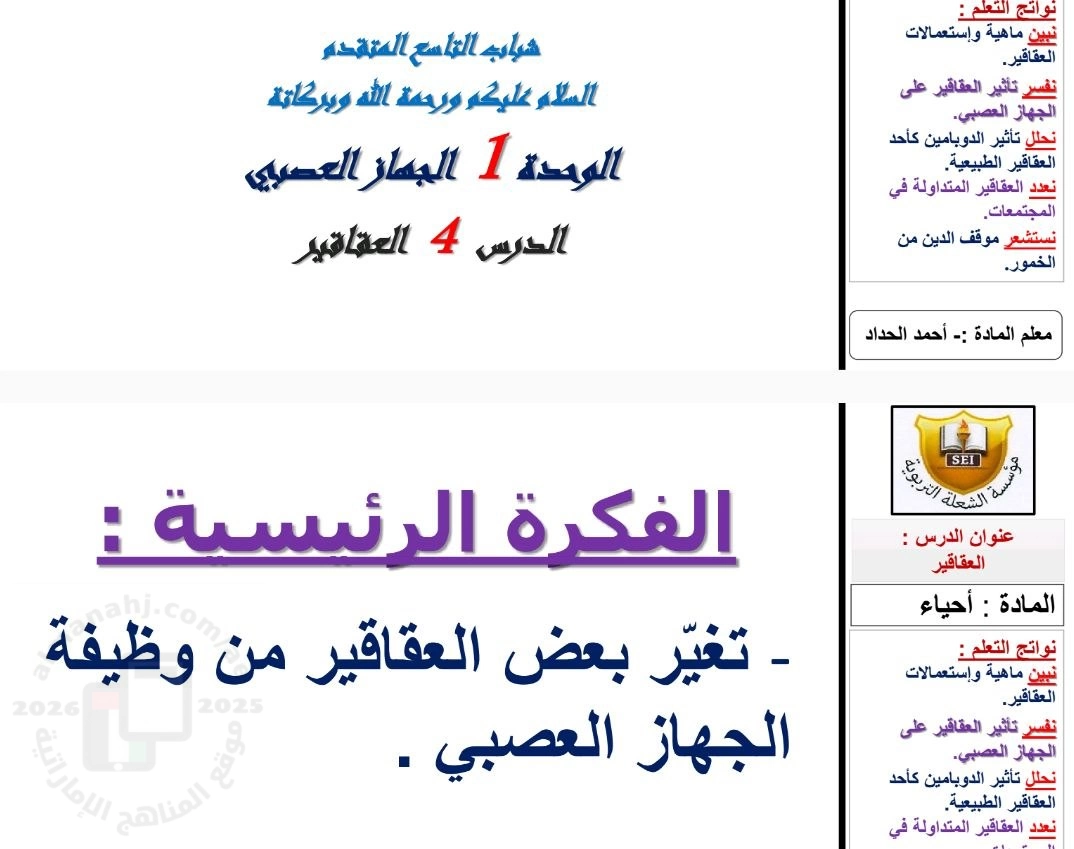 تم إيجاد الملف: شرح الدرس الرابع العقاقير من الوحدة الأولى الجهاز العصبي