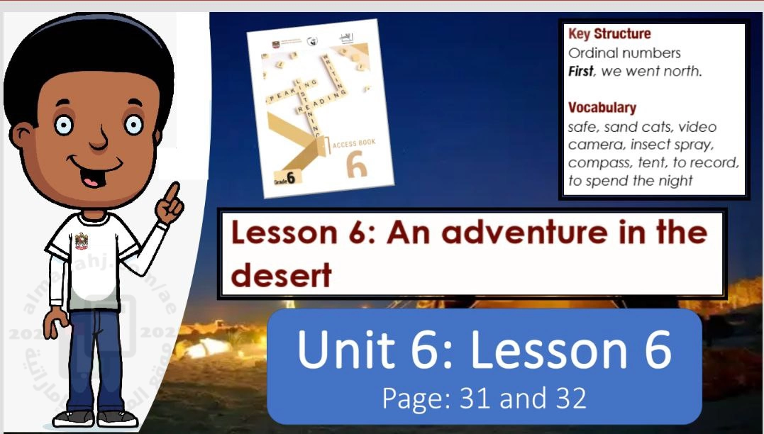 عرض بوربوينت الدرس السادس An adventure in the desert من الوحدة السادسة منهج أكسس, الصف السادس, لغة انجليزية, الفصل الثاني, 2025-2026 - المناهج الإماراتية