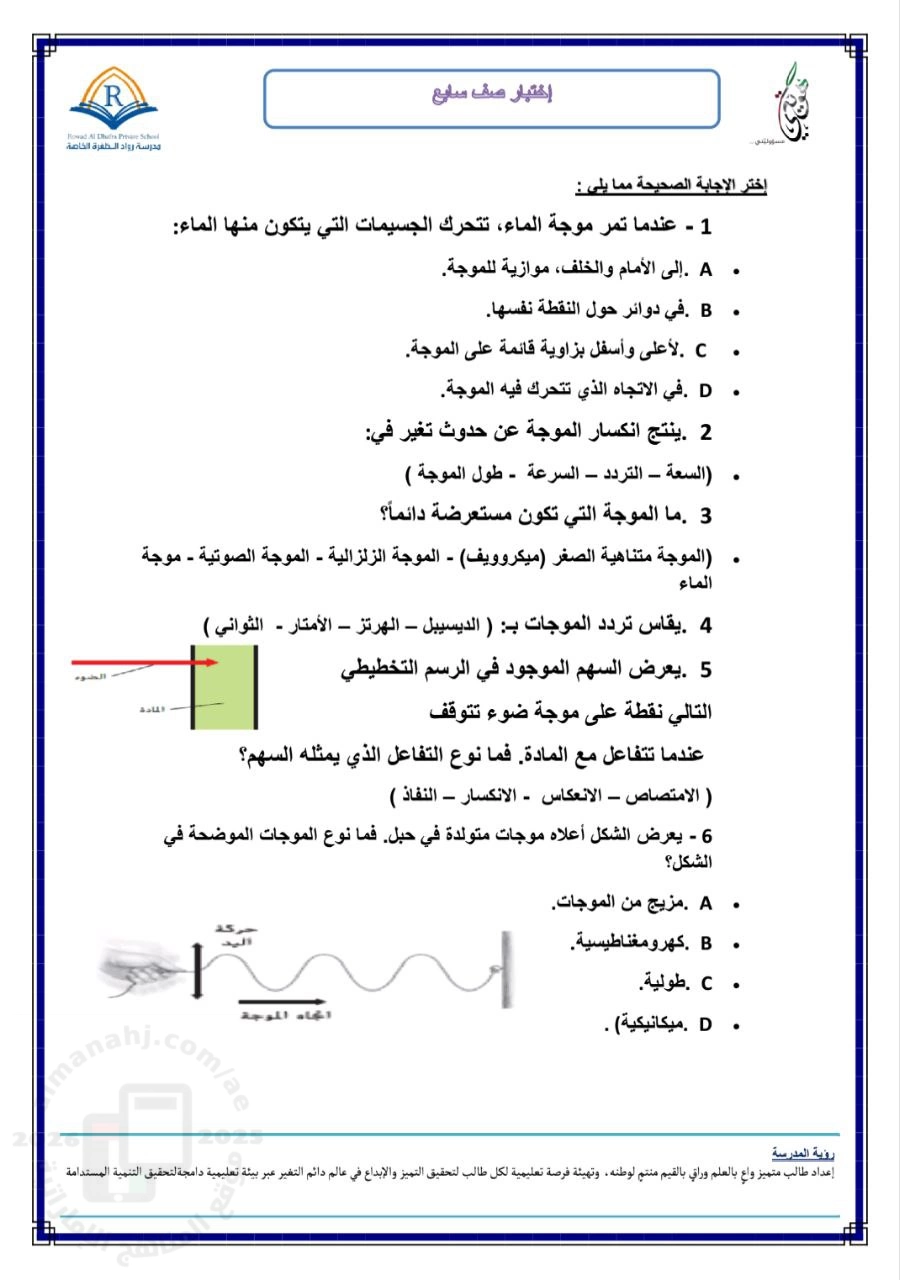 تم إيجاد الملف: أسئلة اختبار قصير الوحدة السادسة الموجات والصوت