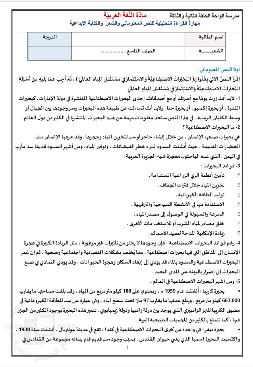 معلومات الملف: اختبار تكويني في مهارة القراءة التحليلية للنص المعلوماتي و الشعر و الكتابة الإبداعية بدون الحل و يشمل أسئلة متنوعة حول : أولاً : النص المعلوماتي ثانياً : الشعر | ||