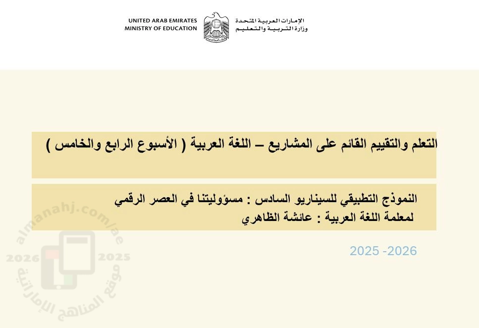 | تطوير نموذج الحل واختباره وتحسينه النموذج التطبيقي للسيناريو السادس: مسؤوليتنا في العصر الرقمي (الأسبوع الرابع والخامس) - إعداد: عائشة الظاهري | ||