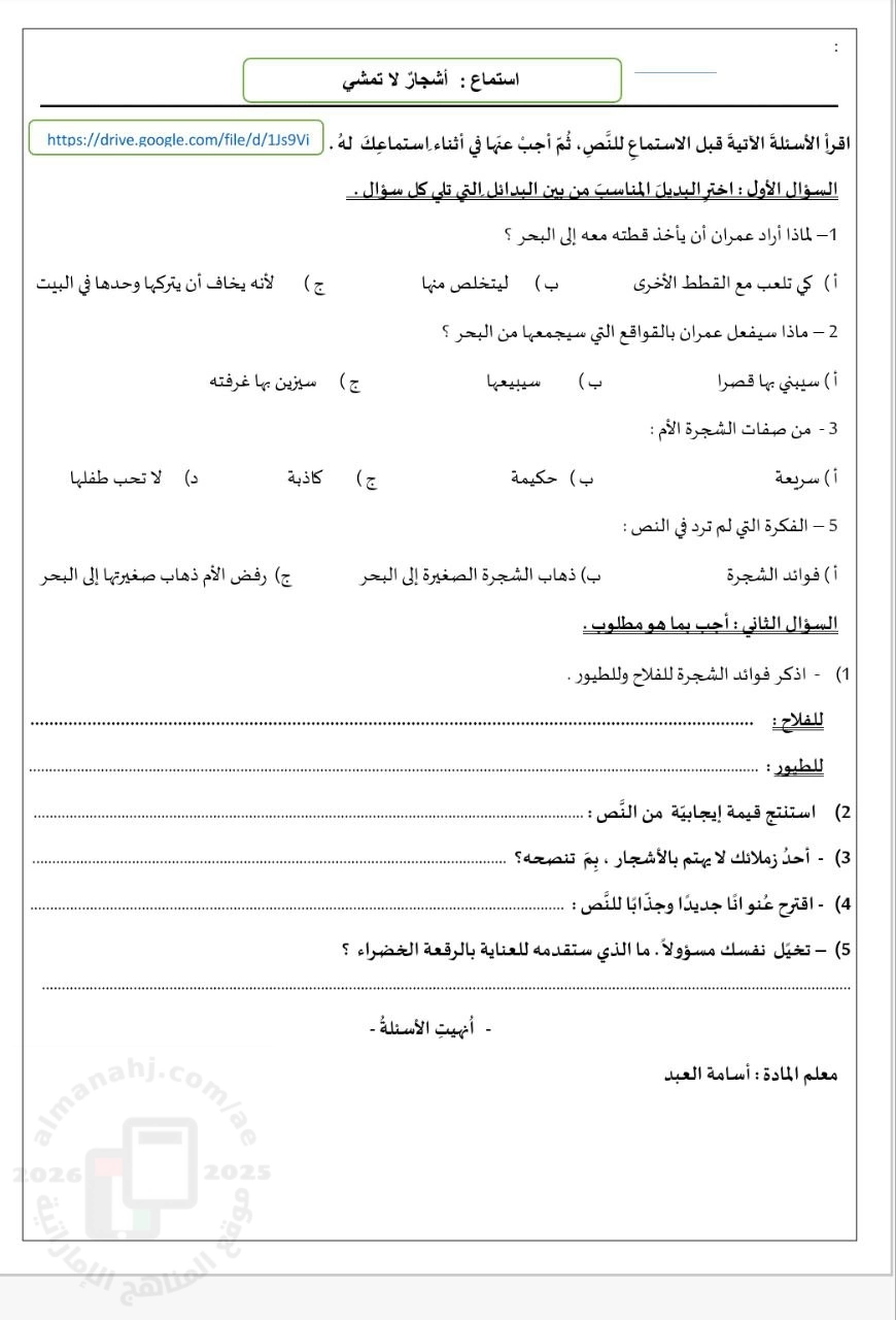 تم إيجاد الملف: أسئلة اختبار استماع نص أشجار لا تمشي