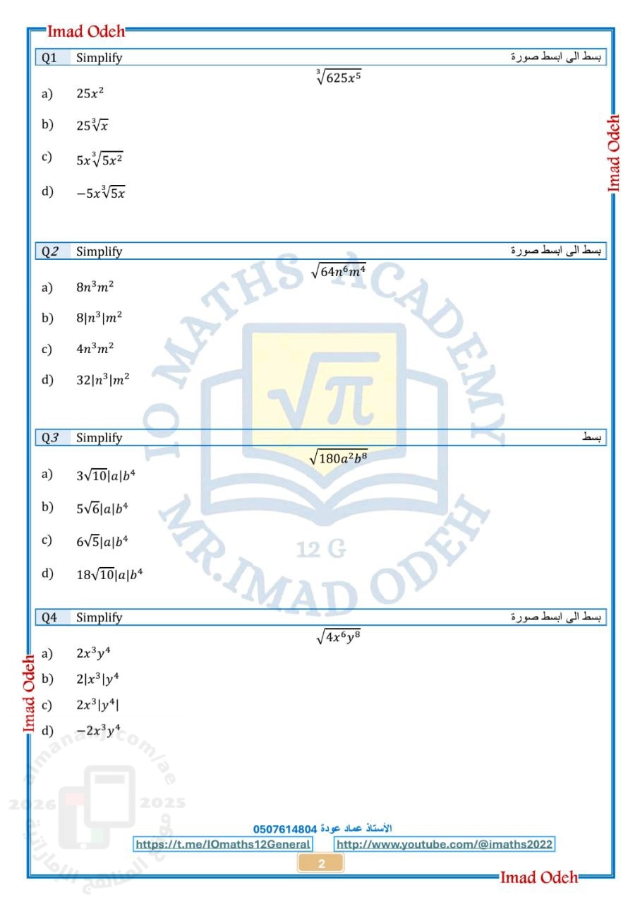 | مراجعة الدرس الخامس العمليات الحسابية على التعابير الجذرية منهج بريدج وريفيل (اختبر نفسك 5) - إعداد: عماد عودة | ||