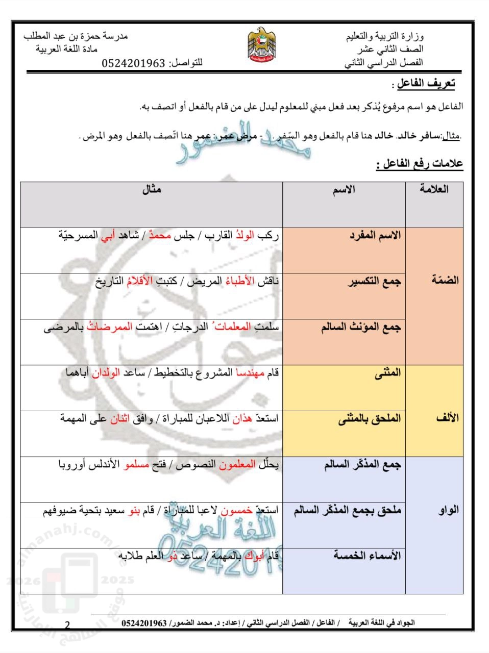 معلومات الملف: 1. تعريف الفاعل 2. علامات رفع الفاعل · الضمة: الاسم المفرد، جمع التكسير، جمع المؤنث السالم. 3. أنواع الفاعل · اسم علم (خالد، فاطمة). ب. ضمير متصل · تاء الفاعل (قمتُ). ملاحظة: · نا مع الفعل الماضي المبني على السكون: في محل رفع فاعل. ج. ضمير مستتر د. مصدر مؤول · يجب أن تدرس. - | |||