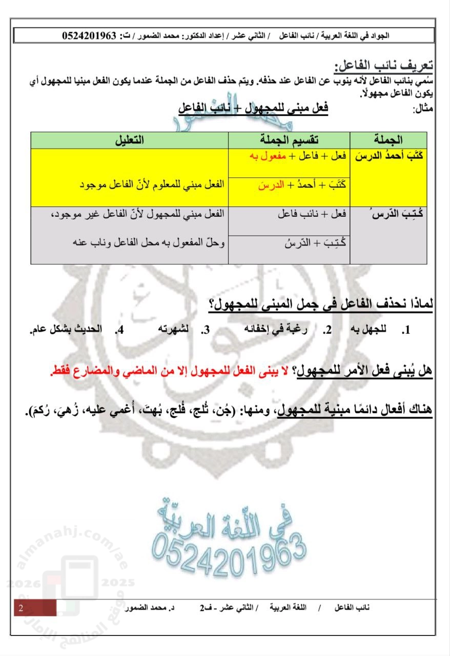 معلومات الملف: تلخيص درس " نائب الفاعل " 1. تعريف نائب الفاعل · هو: اسم مرفوع يحل محل الفاعل بعد حذفه عند بناء الفعل للمجهول. · يُبنى للمجهول من الماضي والمضارع فقط (لا يُبنى فعل الأمر للمجهول). أولاً: الفعل الماضي المبني للمجهول · إذا آخره صحيح: ضم الأول وكسر ما قبل الأخير (كُسِرَ). ثانياً: الفعل المضارع المبني للمجهول · إذا آخره صحيح: ضم الأول وفتح ما قبل الآخر (يُدْرَسُ). · الاسم المفرد: الضمة (كُتِبَ الدرسُ). 4. أنواع نائب الفاعل 1. اسم ظاهر: | ||