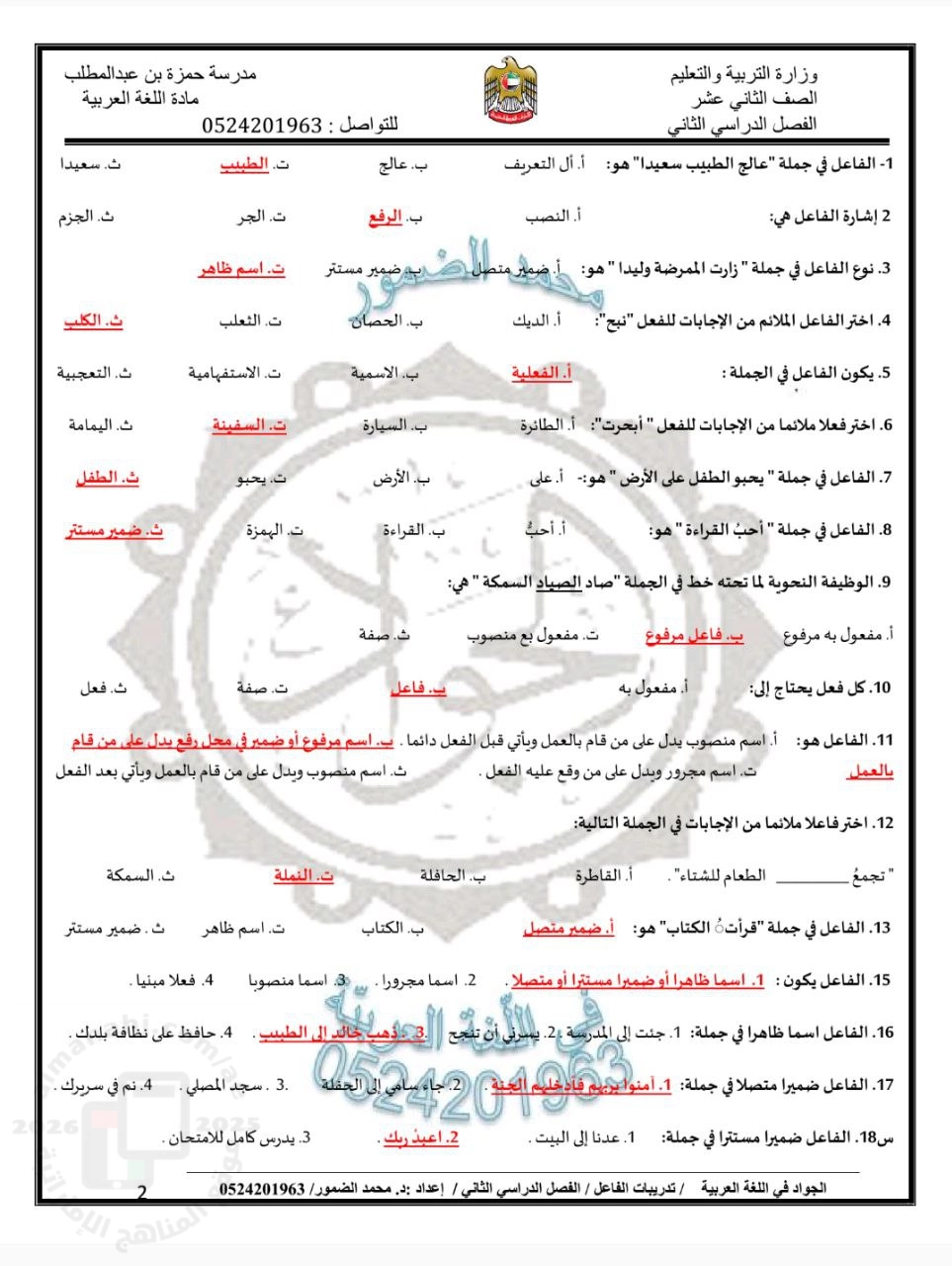 معلومات الملف: إجابات تلخيص تدريبات $الفاعل في اللغة العربية (الصف الثاني عشر) | ||