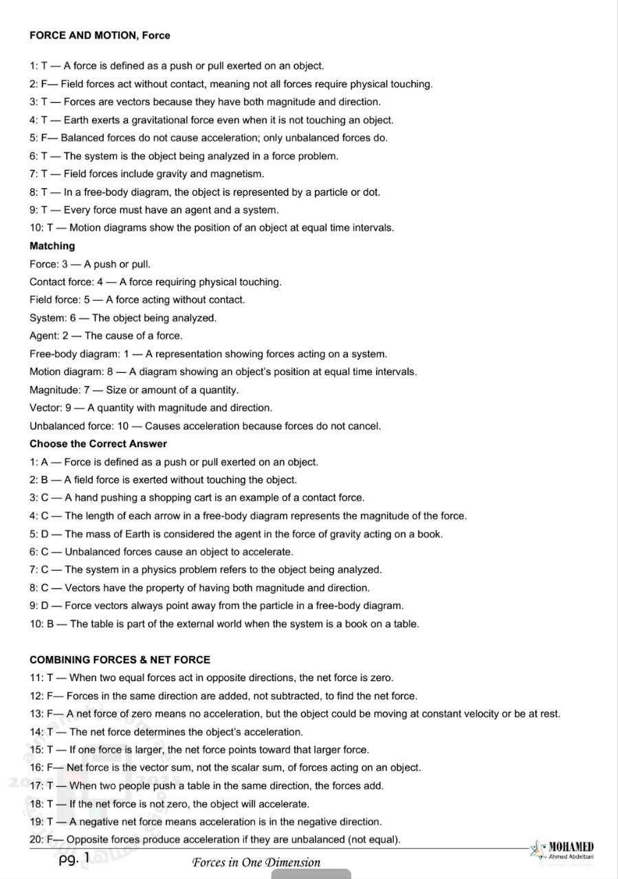 1. الصف التاسع المتقدم, فيزياء, حل أوراق عمل Forces in one dimension منهج انسباير