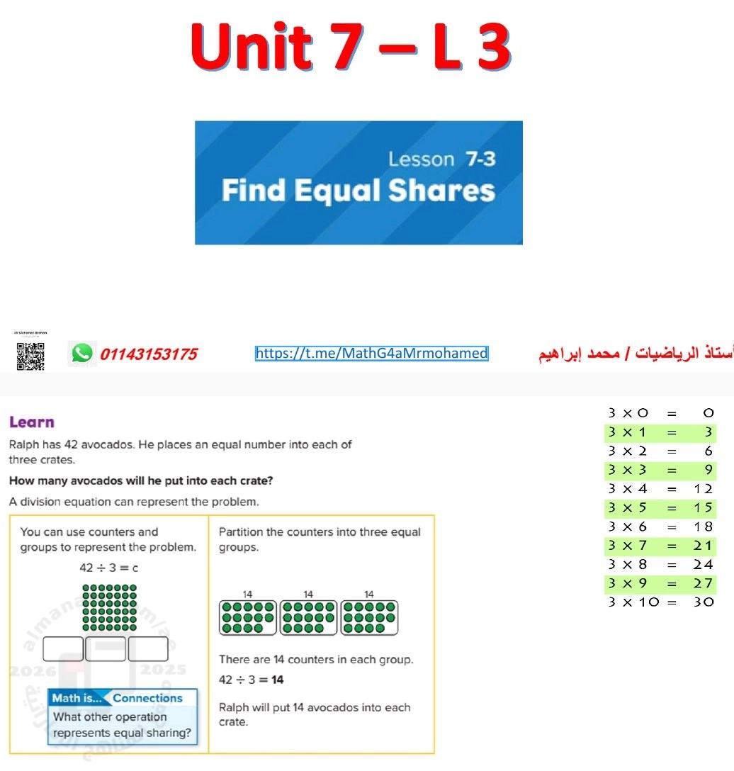 أوراق عمل الدرس الثالث Find Equal Shares من الوحدة السابعة منهج ريفيل, Mohamed Ibrahem, الصف الرابع, رياضيات, الفصل الثاني, 2025-2026, منهج انجليزي - المناهج الإماراتية