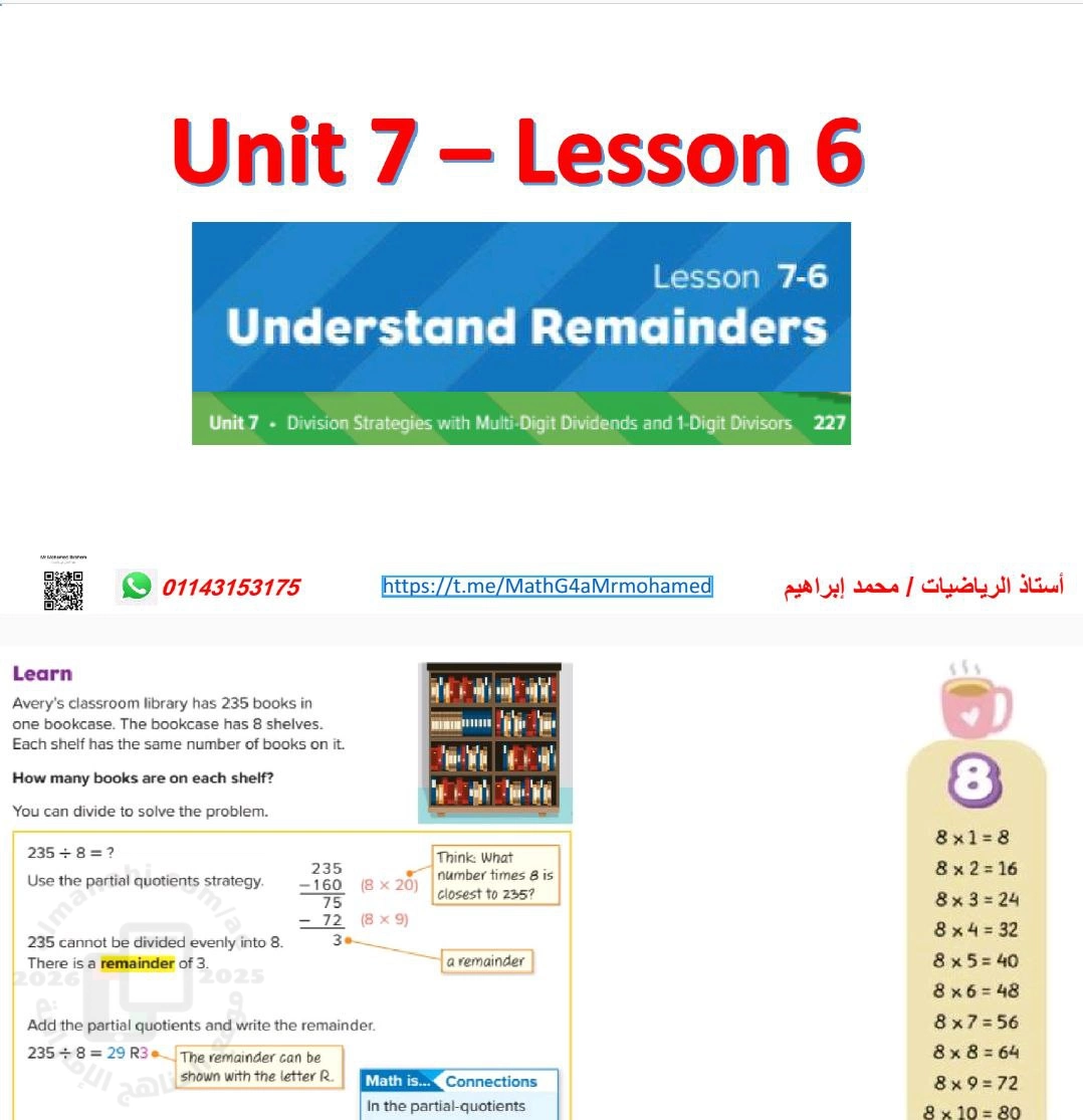 معلومات الملف: أوراق عمل الدرس السادس Understand Remainders من الوحدة السابعة Division strategies with multi-digit dividends and 1-digit divisors منهج ريفيل Reveal