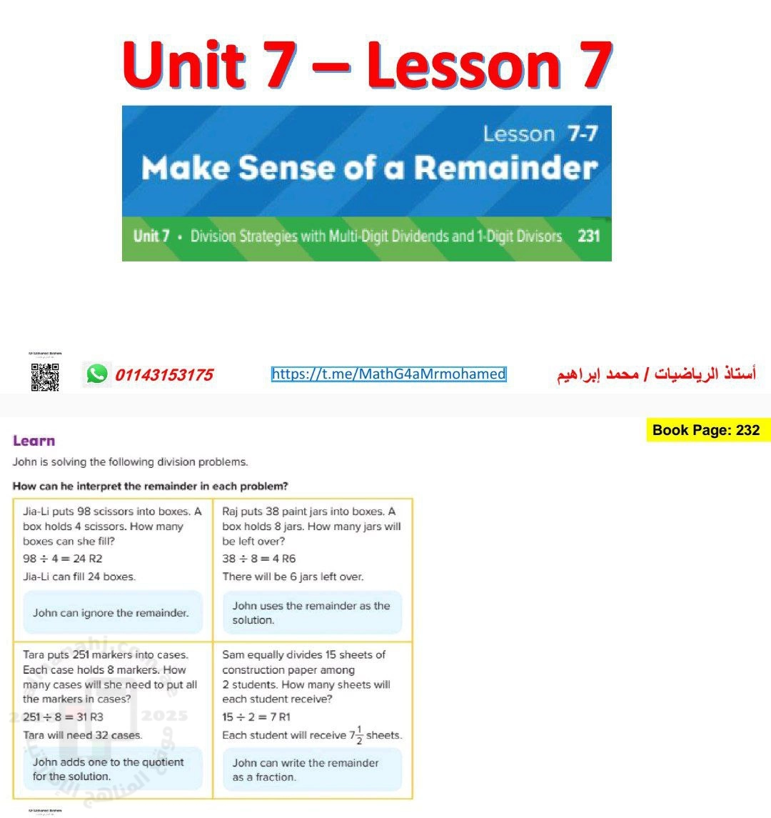 أوراق عمل الدرس السابع Make Sense of a Remainder من الوحدة السابعة منهج ريفيل - إعداد: Mohamed Ibrahem