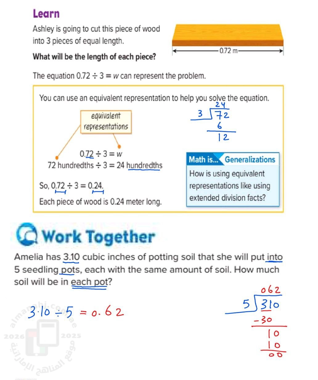 8. حل أوراق عمل الدرس الثالث Represent division of decimals by a whole number من الوحدة الثامنة منهج ريفيل