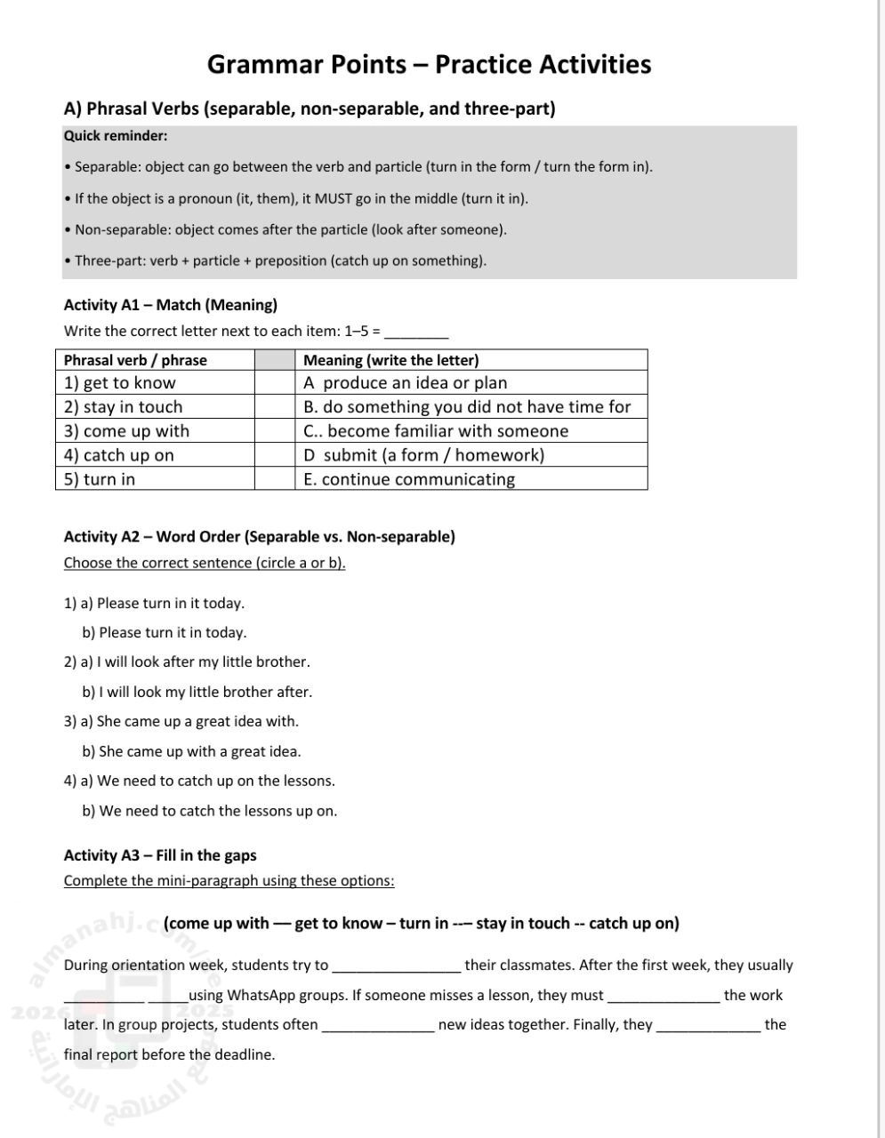 | أوراق عمل Grammar Points – Practice Activities المسار العام | ||