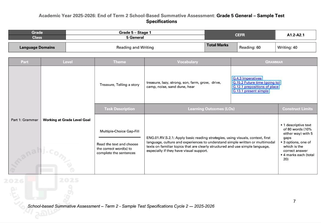 معلومات الملف: مواصفات الاختبار النهائي للفصل الثاني ( الهيكل الوزاري ) المسار العام Sample test specificatons School - based summative assessment End of term 2 Academic year 2025 - 2026 | ||