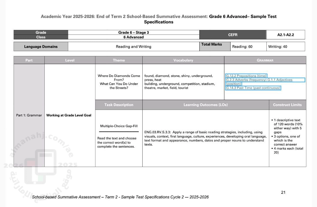 معلومات الملف: مواصفات الاختبار النهائي للفصل الثاني ( الهيكل الوزاري ) المسار المتقدم Sample test specificatons School - based summative assessment End of term 2 Academic year 2025 - 2026 | ||