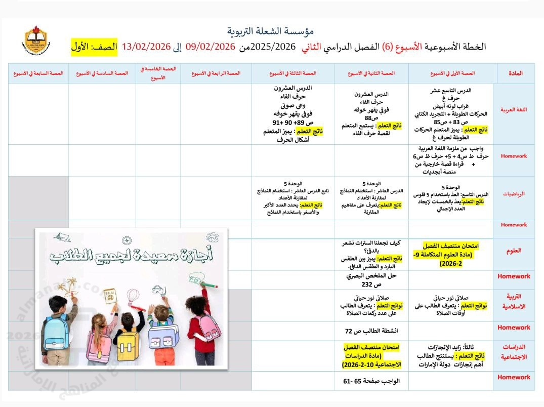 معلومات الملف: فيما يلي نسخة من الخطط الأسبوعية لطلابنا الأعزاء وأولياء أمورهم الكرام ، للصفوف من ( الروضة حتى الثاني عشر ) الأسبوع السادس من الفصل الدراسي الثاني من الأثنين : 09-02-2026 | ||