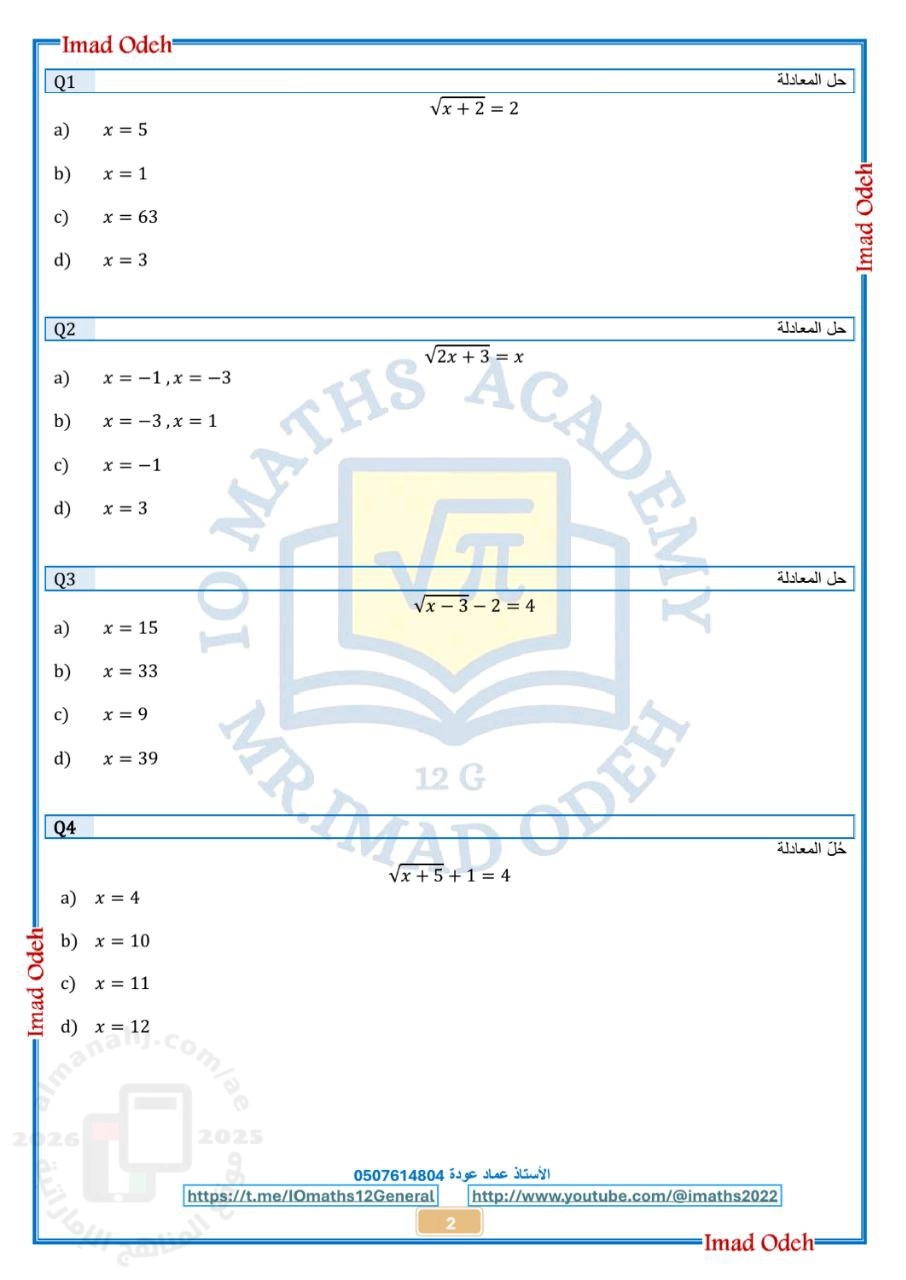 | مراجعة الدرس السابع حل المعادلات الجذرية والمتباينات منهج بريدج (اختبر نفسك 7) - إعداد: عماد عودة | ||