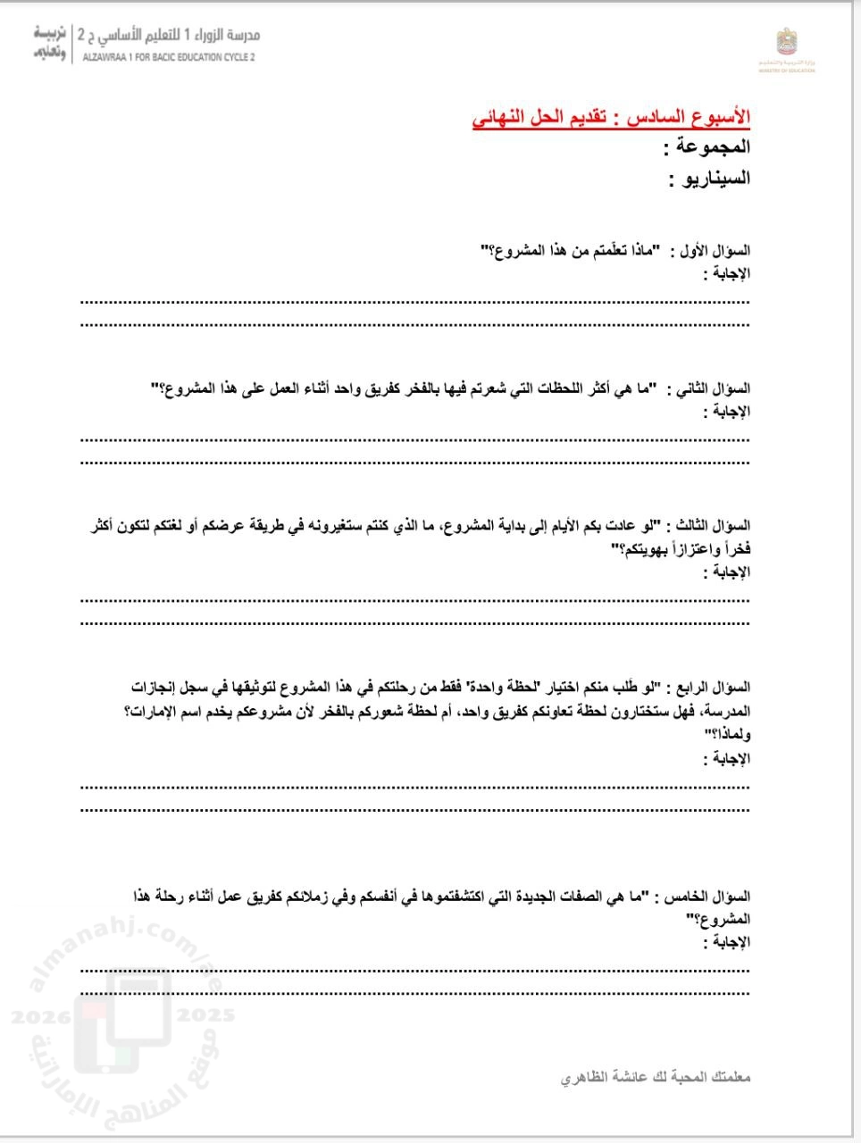 | ورقة عمل الفريق الأسبوع السادس تقديم الحل النهائي من التعلم القائم على المشاريع - إعداد: عائشة الظاهري | ||
