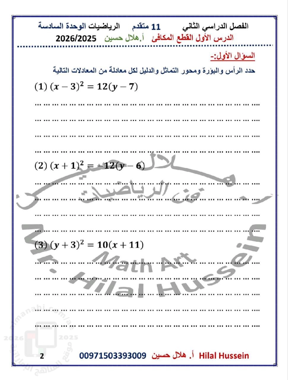 | أوراق عمل الدرس الأول القطع المكافئ من الوحدة السادسة - إعداد: هلال حسين | ||