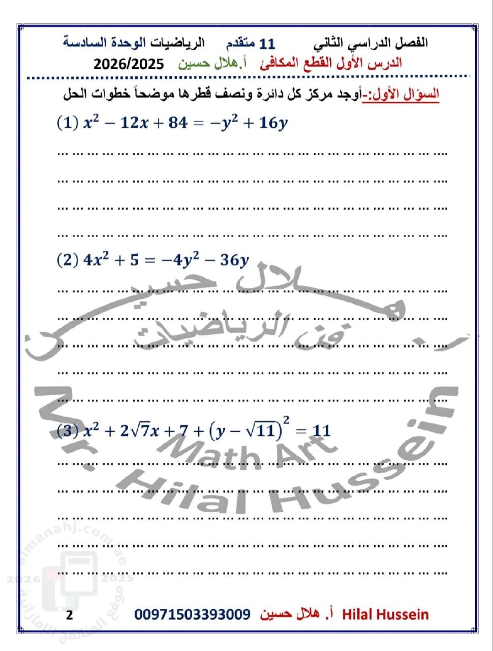 معلومات الملف: أوراق عمل الدرس الثاني : الدوائر من الوحدة السادسة : القطوع المخروطية و المعادلات الوسيطية بدون الحل | ||