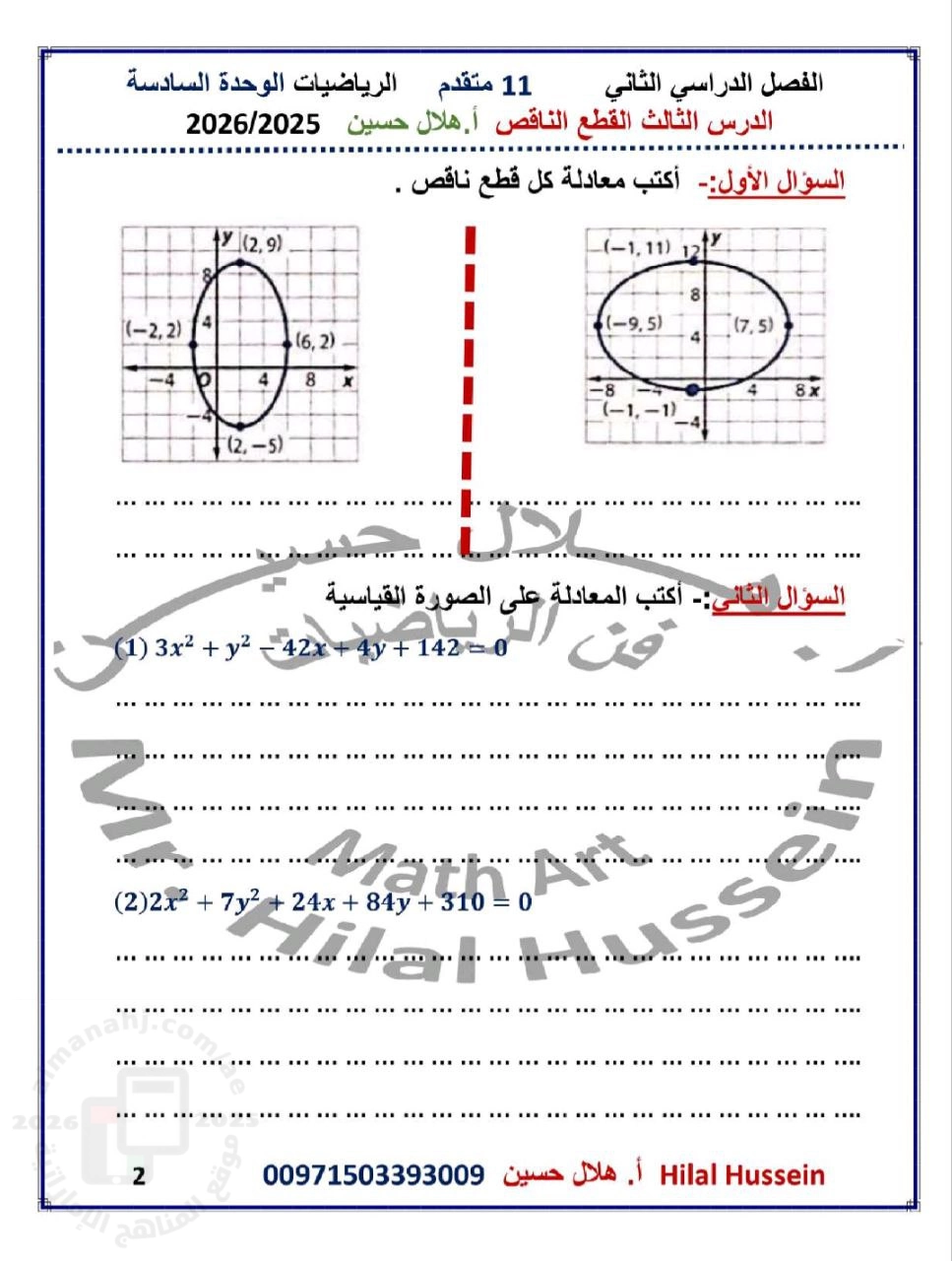 | أوراق عمل الدرس الثالث القطع الناقص من الوحدة السادسة - إعداد: هلال حسين | ||
