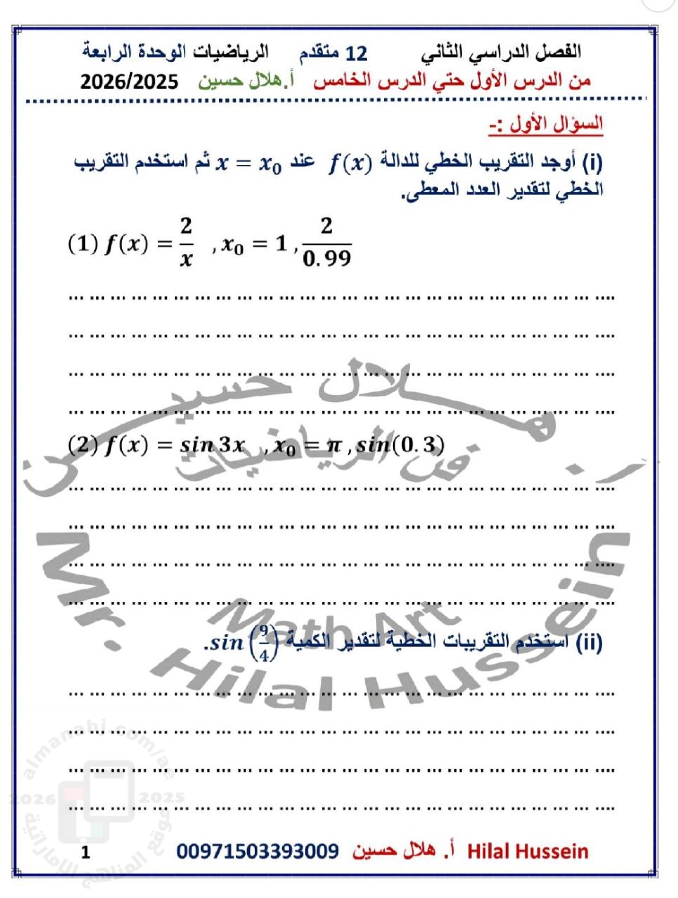 | أوراق عمل من الدرس الأول حتى الدرس الخامس من الوحدة الرابعة تطبيقات التفاضل - إعداد: هلال حسين | ||