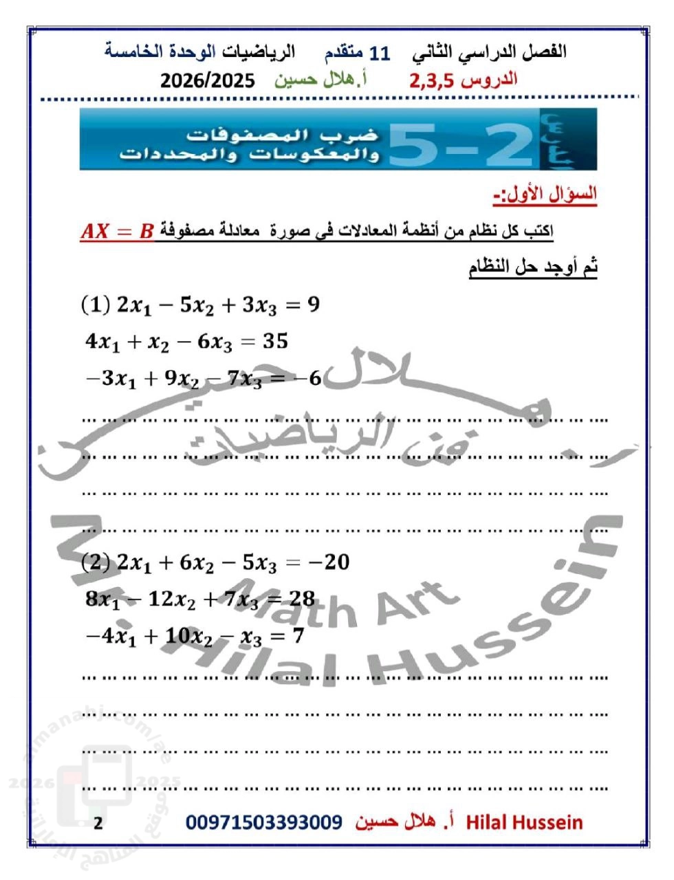 | أوراق عمل الدروس الثاني والثالث والخامس من الوحدة الخامسة أنظمة المعادلات والمصفوفات - إعداد: هلال حسين | ||