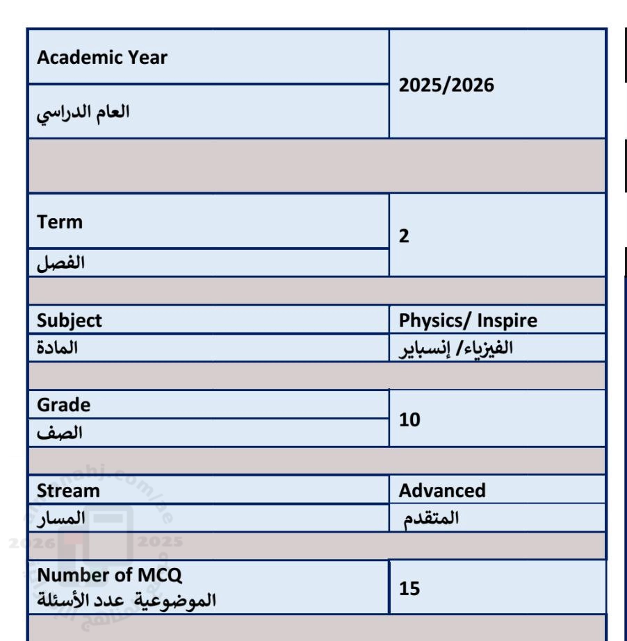 هيكل الامتحان النهائي للفصل الدراسي الثاني منهج انسباير, الصف العاشر المتقدم, فيزياء, الفصل الثاني, 2025-2026, منهج انجليزي - المناهج الإماراتية