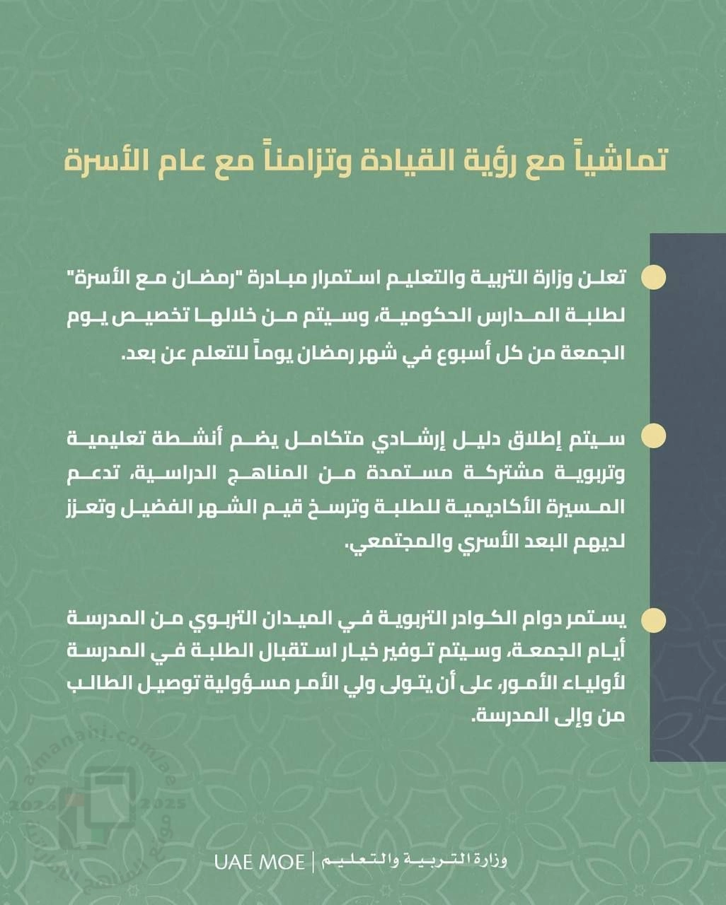 | أعلنت وزارة التربية والتعليم استمرار مبادرة "رمضان مع الأسرة" لطلبة المدارس الحكومية ، وسيتم من خلالها تخصيص يوم الجمعة من كل أسبوع في شهر رمضان يوماً للتعلم عن بعد. وأكدت الوزارة عبر حسابها على منصة "إكس"، أنه سيتم إطلاق دليل إرشادي متكامل يضم أنشطة تعليمية وتربوية مشتركة مستمدة من المناهج الدراسية، تدعم المسيرة الأكاديمية للطلبة وترسخ قيم الشهر الفضيل وتعزز لديهم البعد الأسري والمجتمعي. وشددت على استمرار دوام الكوادر التربوية في الميدان التربوي من المدرسة أيام الجمعة، وسيتم توفير خيار استقبال الطلبة في المدرسة لأولياء الأمور، على أن يتولى ولي الأمر مسؤولية توصيل الطالب من وإلى المدرسة | ||