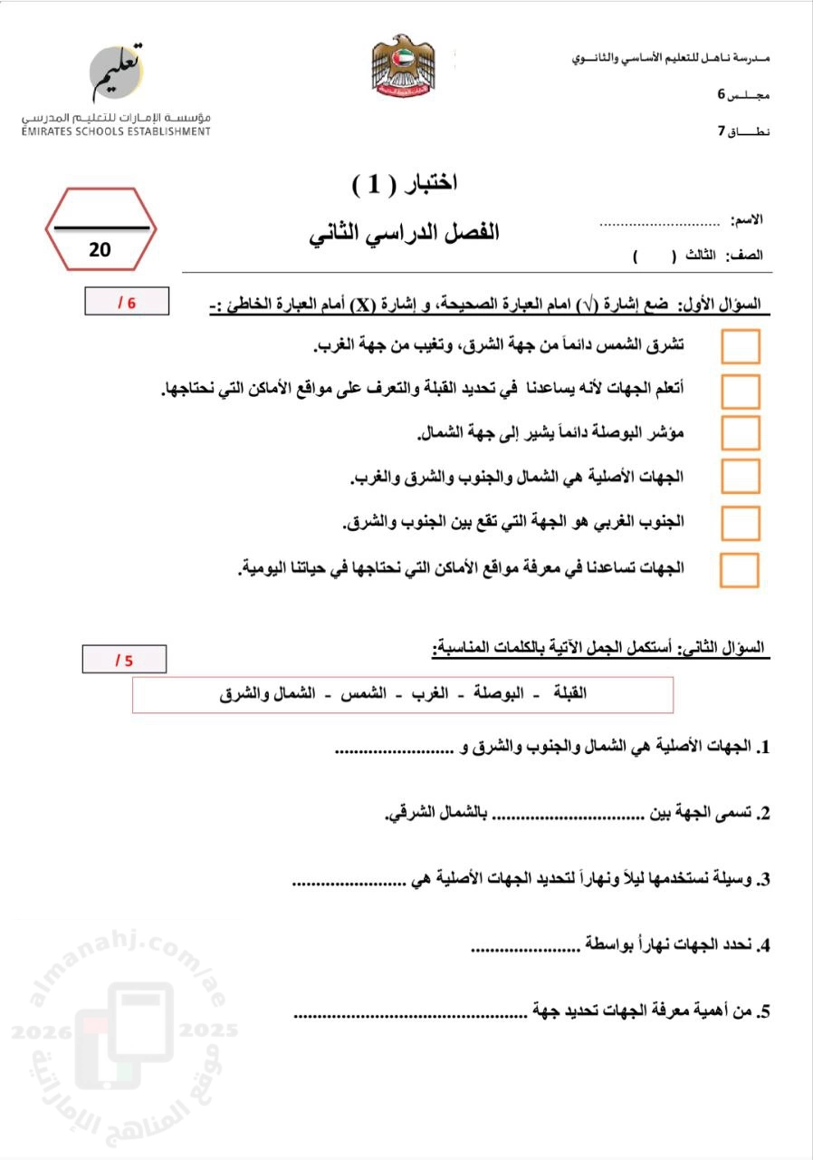 معلومات الملف: الاختبار مخصص للصف الثالث، ويقيس فهم الطالب للجهات الأصلية والفرعية، وأدوات تحديدها، وأهمية معرفتها. يتكون من أربعة أسئلة: 1. الصواب والخطأ (6 عبارات): | ||