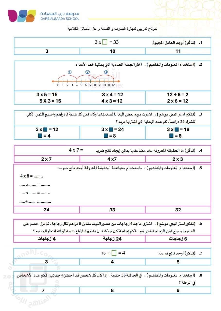 | نموذج تدريبي لمهارة الضرب والقسمة وحل المسائل الكلامية - إعداد: مدرسة درب السعادة | ||