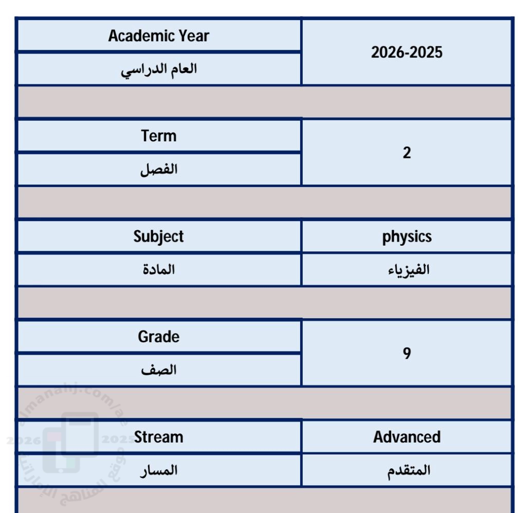 5. الصف التاسع المتقدم, فيزياء, هيكل الامتحان النهائي للفصل الدراسي الثاني منهج انسباير