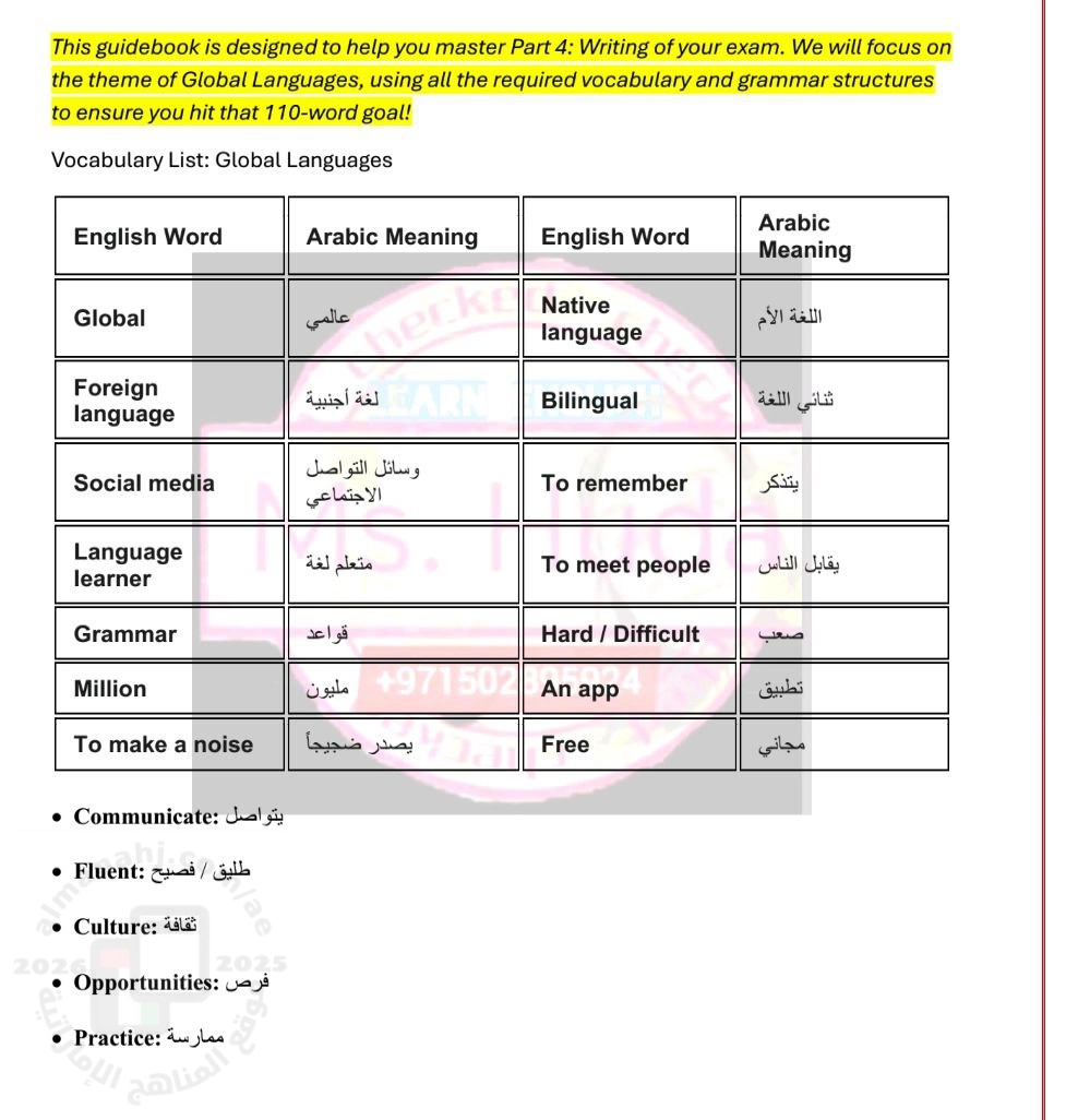 معلومات الملف: دليل الكتابة للصف الثامن - الفصل الدراسي الثاني إعداد: مس هدى أبو زايد (معلمة مرخصة) الهدف الأساسي: يساعد هذا الدليل الطلاب على إتقان الجزء الرابع من الامتحان (الكتابة) من خلال موضوع "اللغات العالمية"، بهدف الوصول إلى 110 كلمة. مكونات الدليل: 1. قائمة المفردات: تتضمن كلمات أساسية مثل: عالمي (Global)، لغة أجنبية (Foreign language)، ثنائي اللغة (Bilingual)، وسائل التواصل الاجتماعي (Social media)، تطبيق (App)، وغيرها مع ترجمتها. الخلاصة: هذا الدليل هو خريطة طريق شاملة لطلاب الصف الثامن تساعدهم على تنظيم أفكارهم واستخدام المفردات والقواعد المطلوبة لكتابة موضوع متكامل باللغة الإنجليزية في امتحان الفصل الدراسي الثاني. | ||