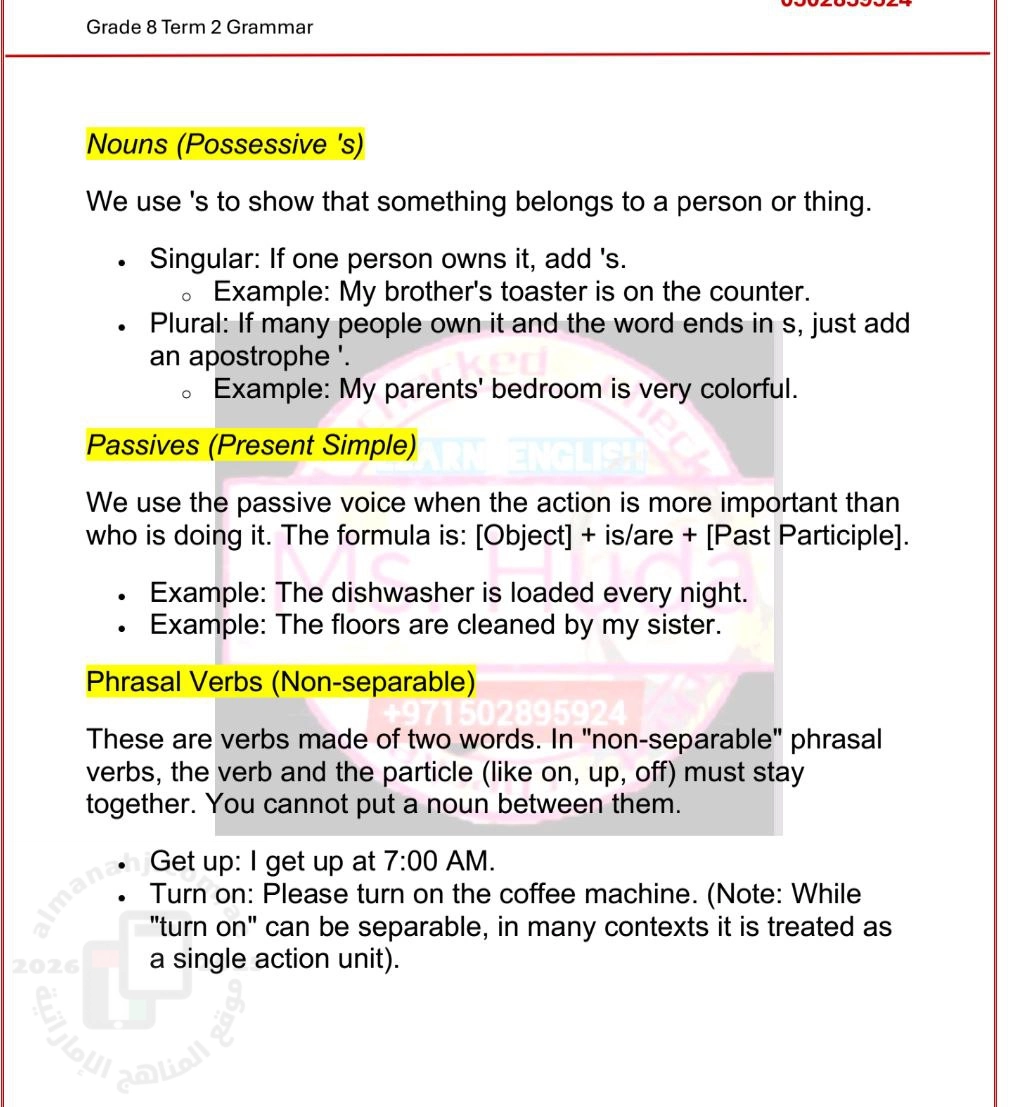 معلومات الملف: أوراق عمل و ملخص قواعد الفصل الثاني 1. Nouns (Possessive &039;s) الملكية: · للمفرد: نضيف &039;s 2. Passives (Present Simple) المبني للمجهول: · نستخدمه عندما الفعل أهم من الفاعل. 3. Phrasal Verbs (Non-separable) أفعال مركبة غير قابلة للفصل: · الفعل والأداة يبقوا معًا، لا يمكن وضع اسم بينهم. 4. Phrasal Verbs (Three-part) أفعال مركبة من 3 أجزاء: · فعل + أداة + حرف جر، وغير قابلة للفصل أبدًا. 5. Adjectives (Comparatives) صفات المقارنة: · للكلمات القصيرة: نضيف er 6. Conditionals (Zero Conditional) الجمل الشرطية (صفر): · للحقائق العامة. | ||