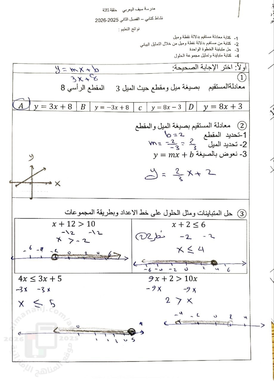 معلومات الملف: حل أسئلة نشاط كتابي نواتج التعلم : كتابة معادلة مستقيم بدلالة نقطة و ميل | ||