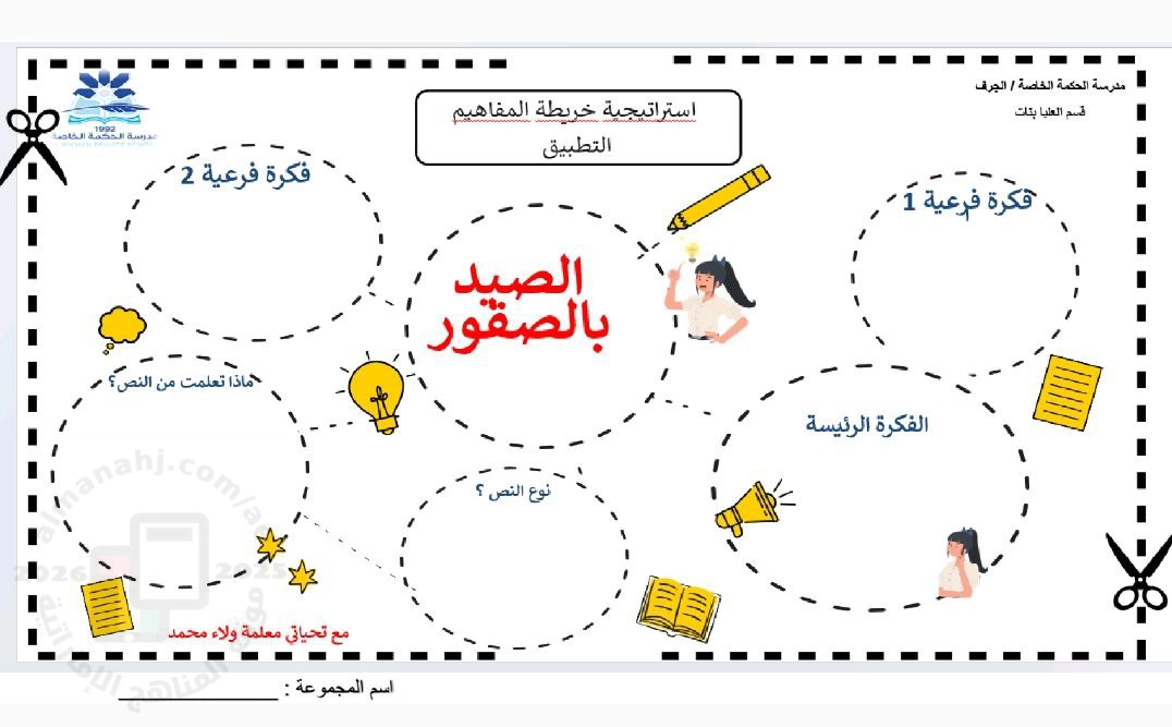 معلومات الملف: و تتضمن : استراتيجية خريطة المفاهيم و التطبيق من الشخصية الرئيسة و المكان و الزمان و الشخصية المساندة و المشكلة و حل المشكلة و الدرس المستفاد | ||