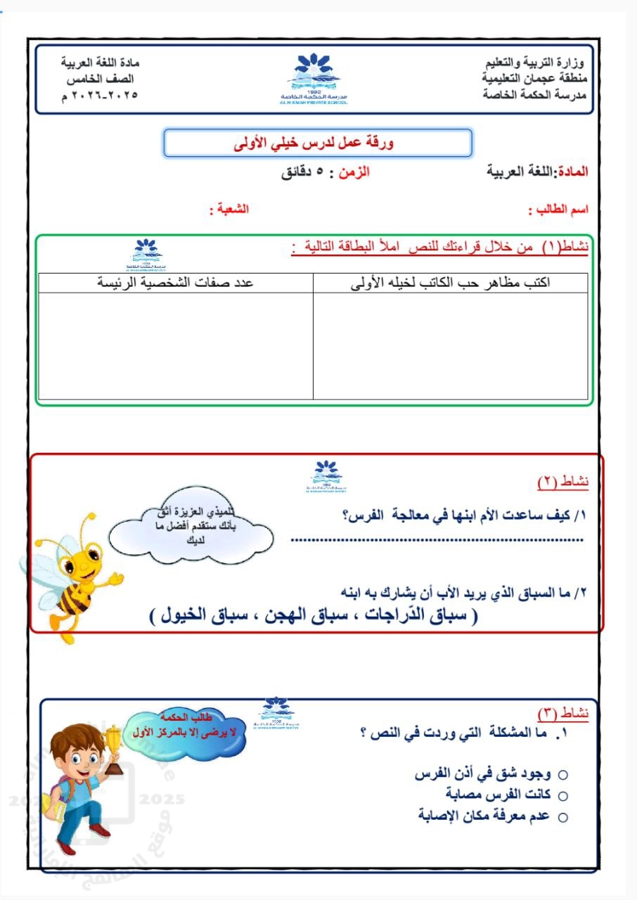 | ورقة عمل قصة خيلي الأولى - إعداد: مدرسة الحكمة الخاصة | ||