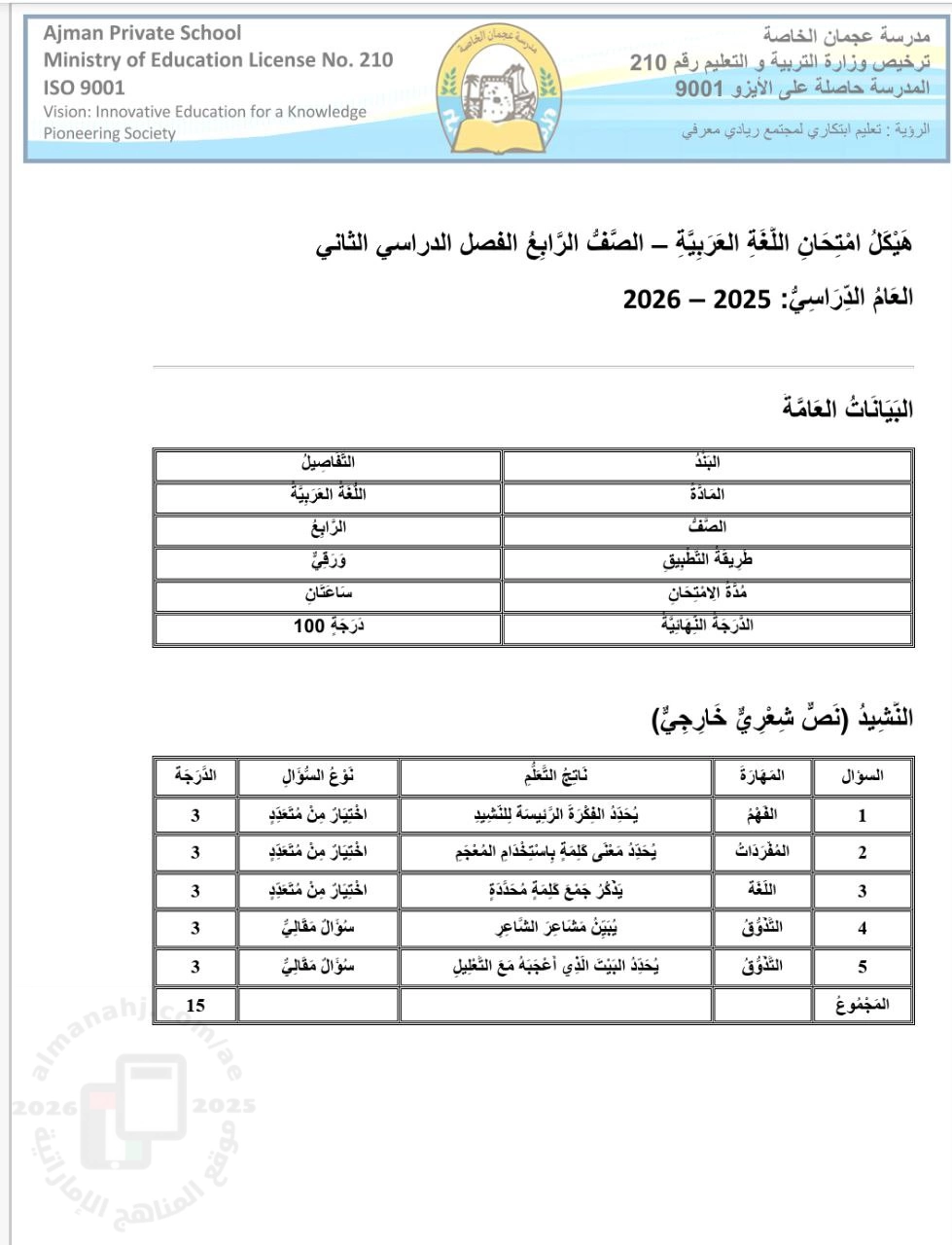 | هيكل الامتحان النهائي للفصل الدراسي الثاني - إعداد: مدرسة عجمان الخاصة | ||
