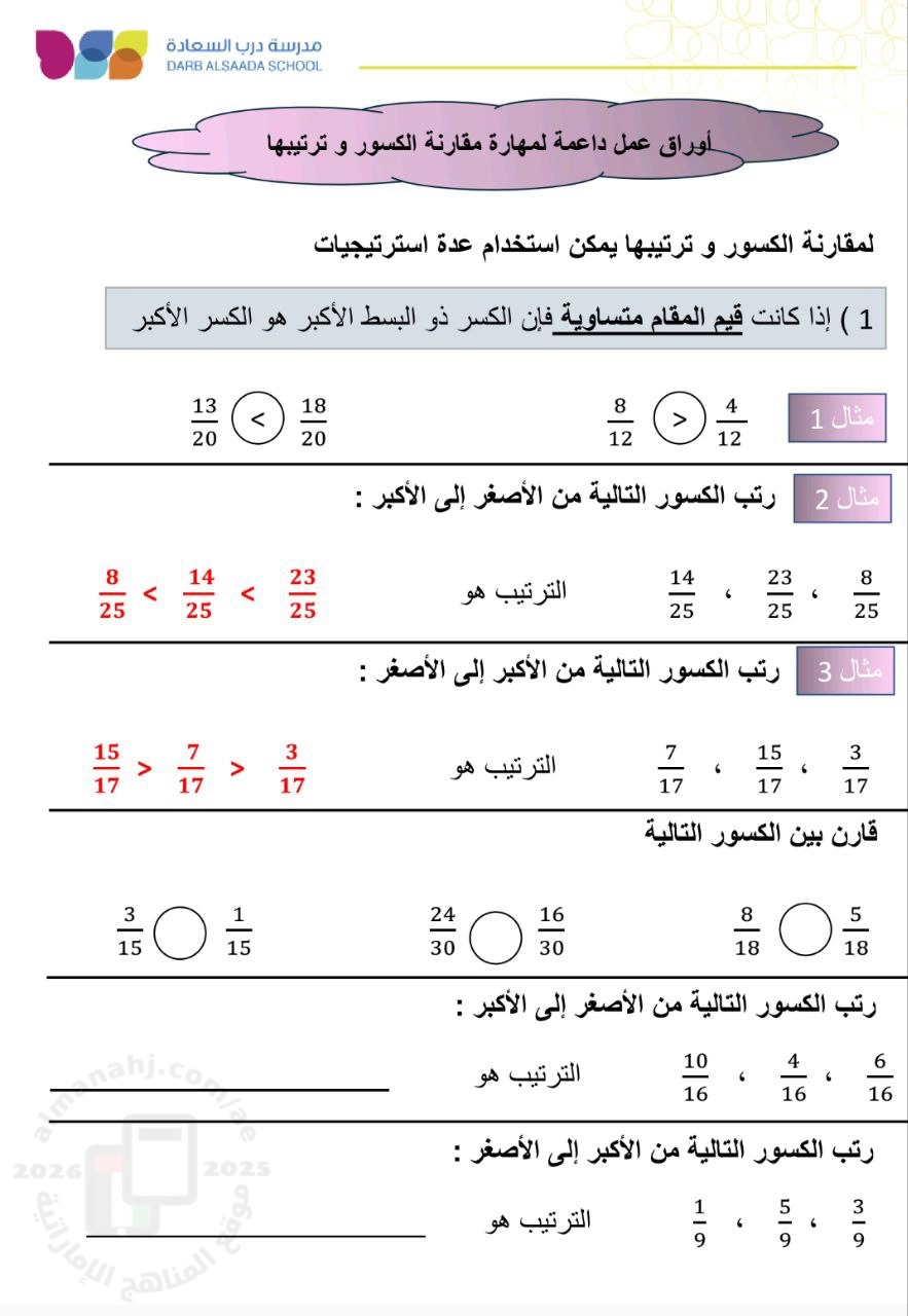 | أوراق عمل داعمة لمهارة مقارنة الكسور. وترتيبها - إعداد: مدرسة درب السعادة | ||