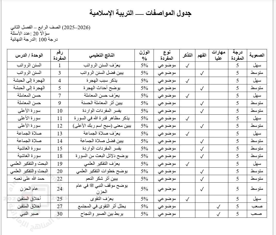 هيكل الامتحان النهائي للفصل الدراسي الثاني, أخبار, تربية اسلامية, الفصل الثاني, 2025-2026 | ||
