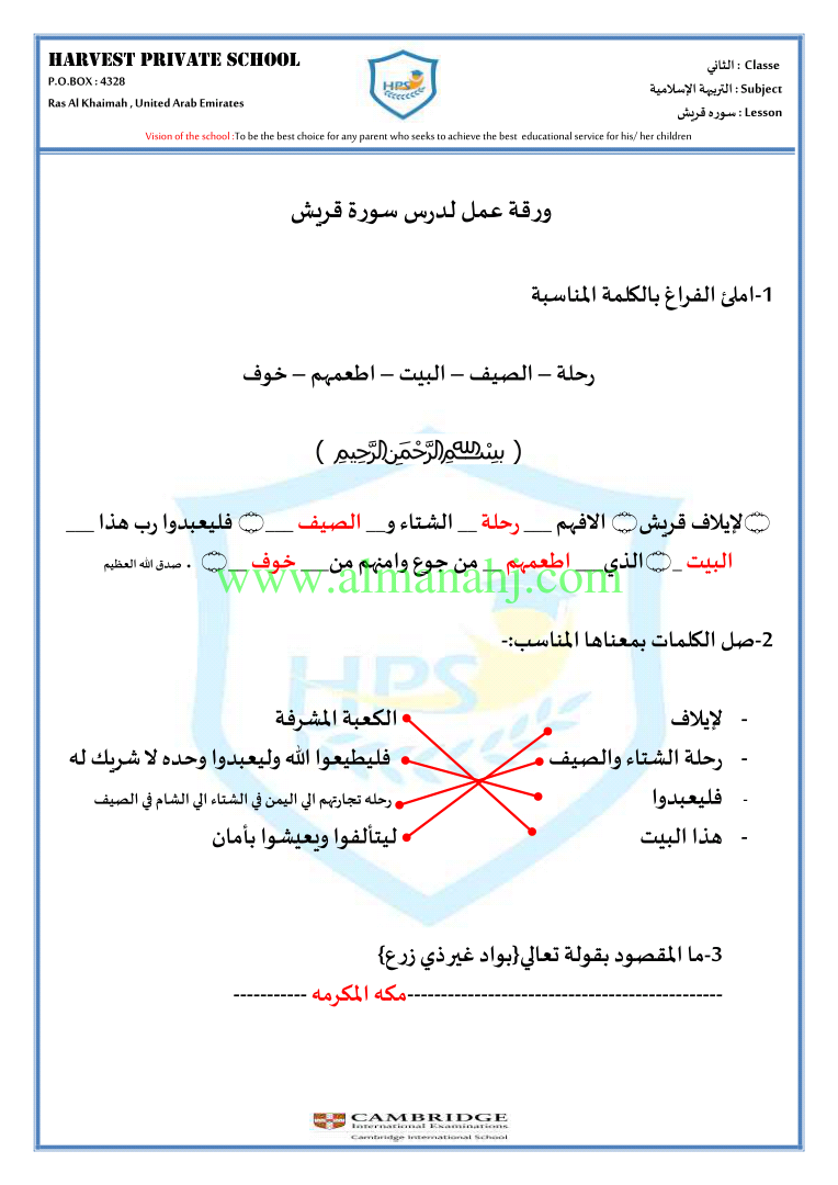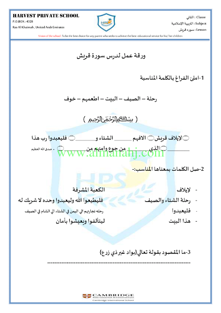 معلومات الملف: الصف الثاني, الفصل الثاني, تربية اسلامية, 2017-2018, ورقة عمل سورة قريش | |||