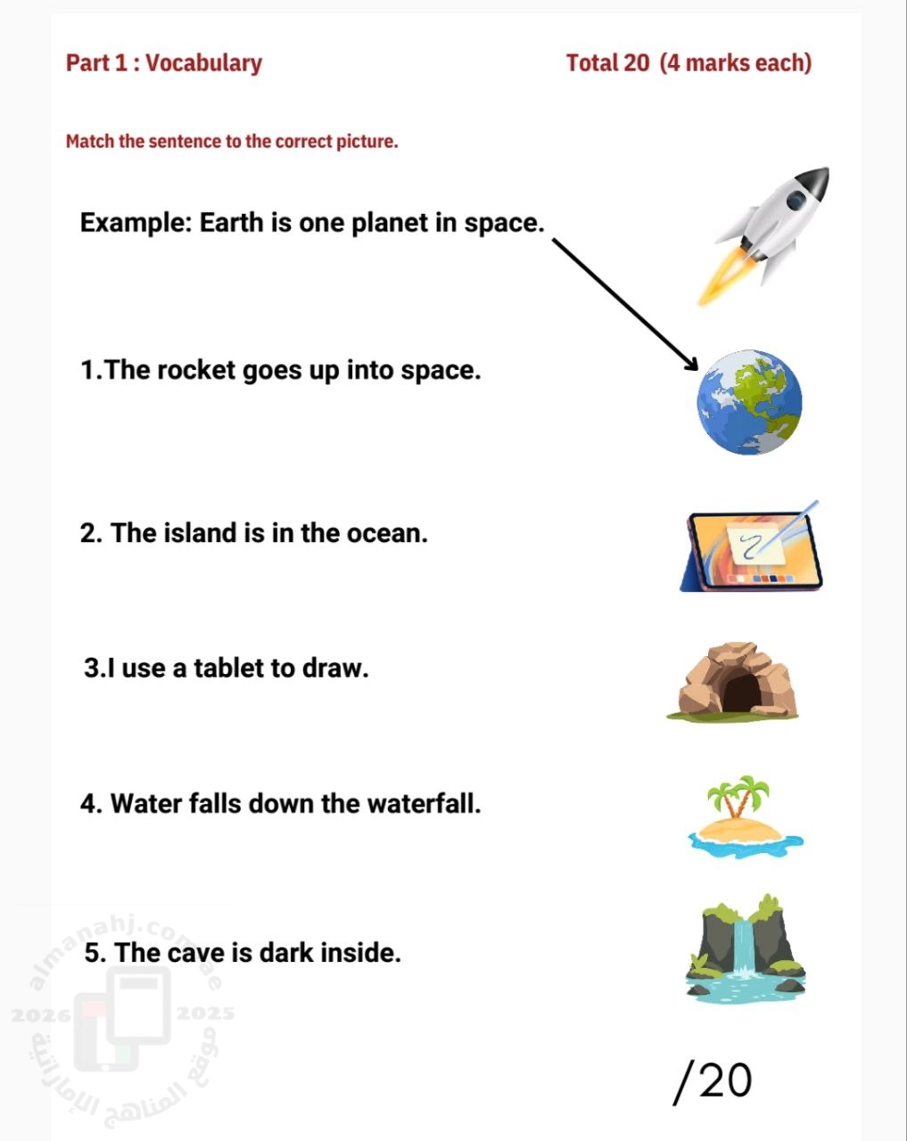 معلومات الملف: امتحان نهاية الفصل الدراسي الثاني للصف الرابع، العام الدراسي 2026/2025م. · أقسام الامتحان: 1. المفردات (الجزء الأول): مطابقة الجمل مع الصور المناسبة. 2. القراءة (الجزءان الثاني والثالث): نصان مع أسئلة اختيار من متعدد. · النص الأول: يتحدث عن الاختراعات الحديثة (مثل الحاسوب والهاتف والكهرباء) وكيف جعلت الحياة أسهل. · النص الثاني: يتحدث عن المباني حول العالم، والفرق بين المباني القديمة (مثل الأهرامات من الحجر) والحديثة (ناطحات السحاب من المعدن والزجاج). 3. الكتابة (الجزء الرابع): كتابة جمل كاملة لوصف صور معينة، مع الاستعانة بمجموعة من الكلمات. | ||