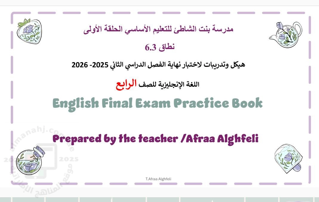 | هيكل وتدريبات للاختبار النهائي متبوعة بالإجابات - إعداد: Afraa Alghfeli | ||