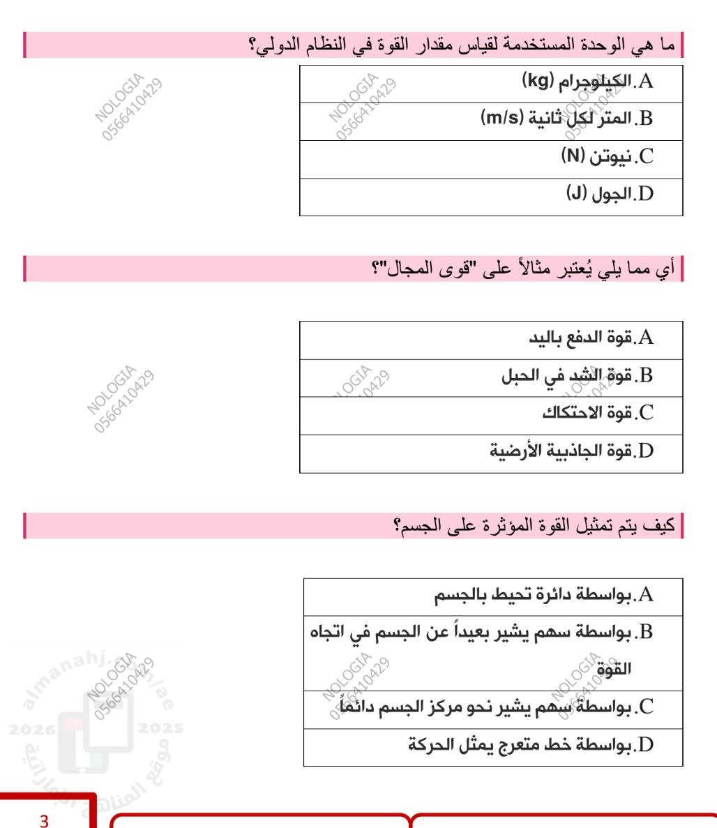 | أسئلة مراجعة نهائية في الوحدة الرابعة القوى في بعد واحد والوحدة الخامسة الإزاحة والقوة في بعدين وفق الهيكل منهج بريدج - إعداد: NOLOGIA | ||