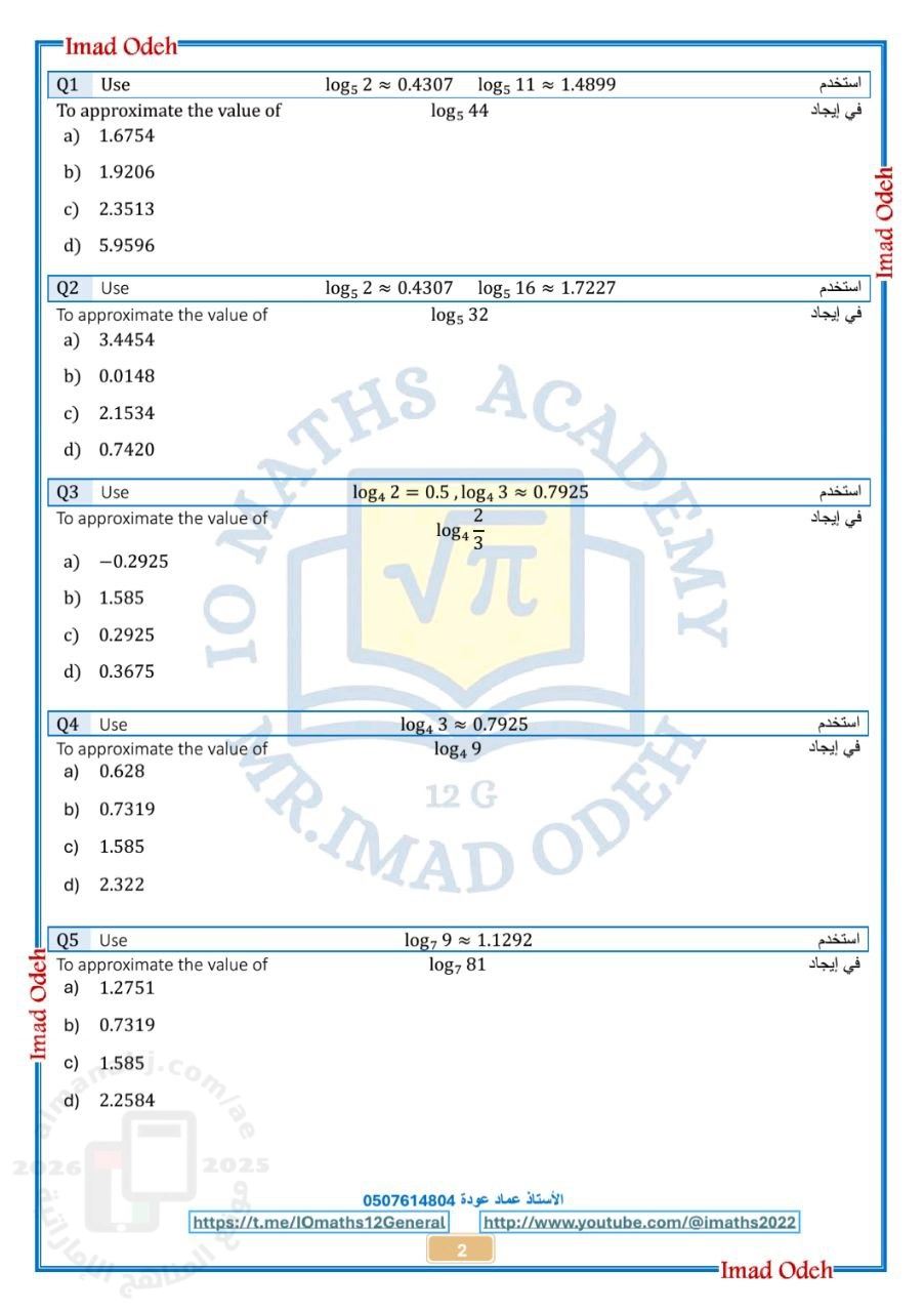 | مراجعة الدرس الثالث خواص اللوغاريتمات منهج بريدج وريفيل (اختبر نفسك 10) - إعداد: عماد عودة | ||