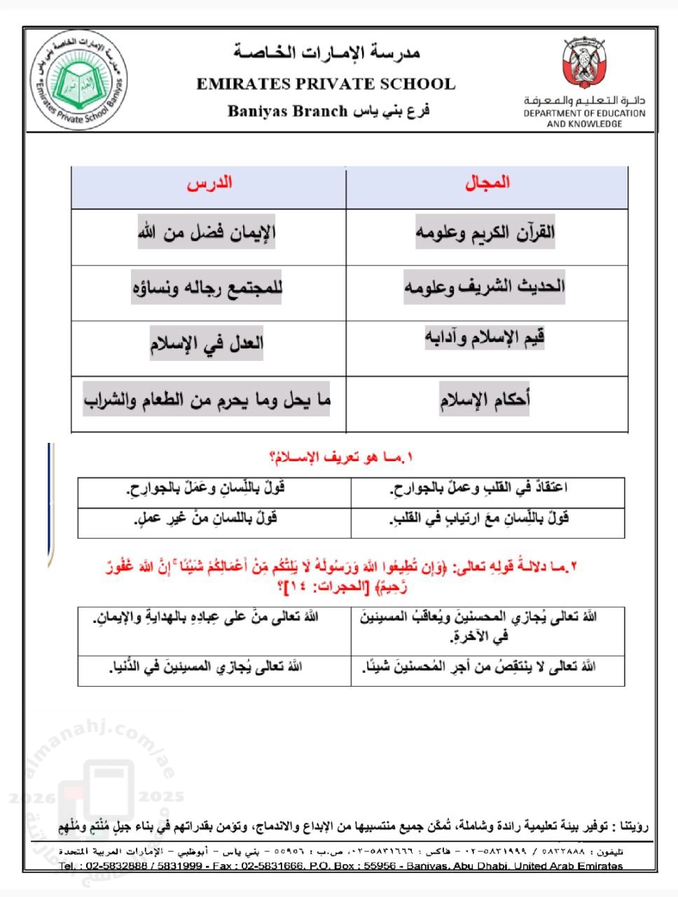 | مراجعة دروس الإيمان وللمجتمع رجاله ونساؤه والعدل ومايحل ومايحرم من الطعام والشراب - إعداد: مدرسة الإمارات الخاصة | ||